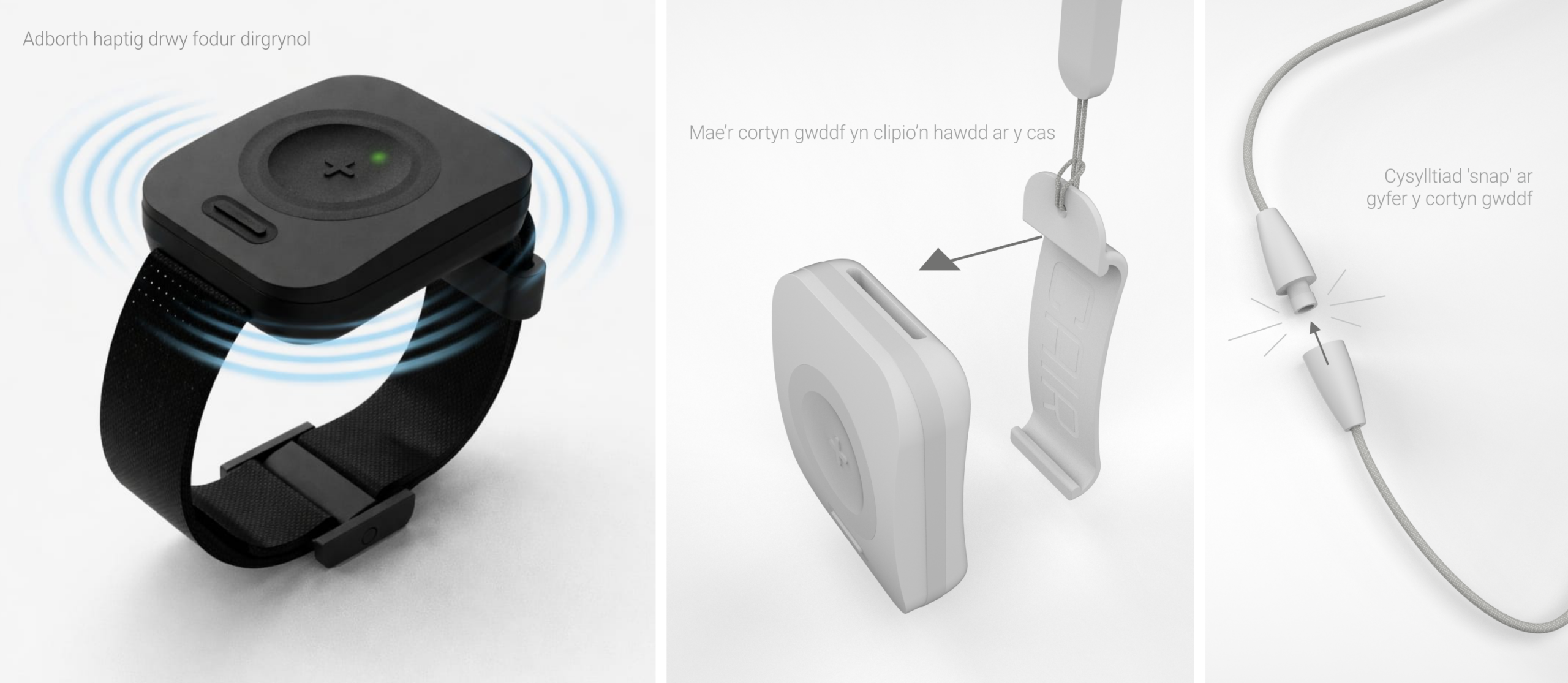 Wrth galon y ddyfais mae botwm galw llaw gyffyrddol, sy’n ei gwneud yn syml ac yn reddfol i godi rhybudd mewn achos o gwymp, pryder neu argyfwng. Unwaith y caiff ei actifadu, mae’r unigolyn yn derbyn adborth haptig cysurlon drwy ddirgryniad ysgafn, ynghyd â dangosydd LED gynnil, gan gadarnhau bod eu galwad wedi’i hanfon yn llwyddiannus.